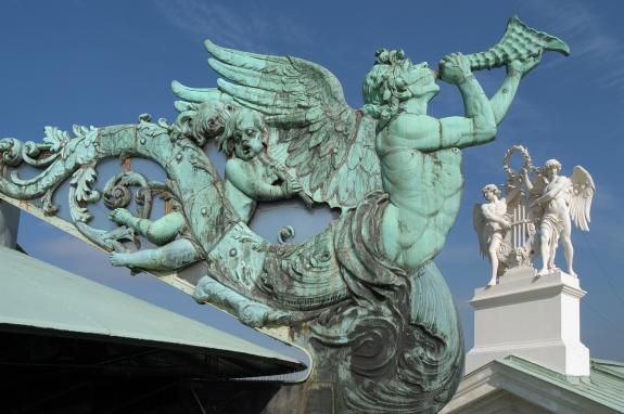 An beiden Flügelenden des Burgtheaters öffnen 45 Minuten vor der Vorstellung die Eingänge über die Feststiegen, einst für Besuche des Kaisers und der Erzherzöge erbaut.